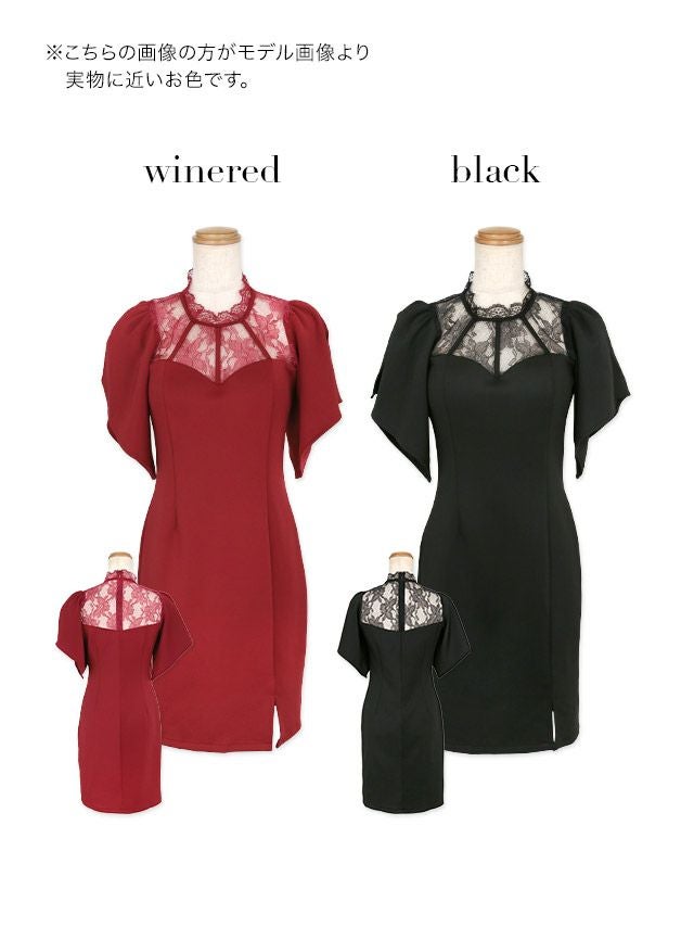 ハイネックフラワーレース切替半袖ペタルスリーブサイドスリットタイトミニドレスのカラーバリエーション
