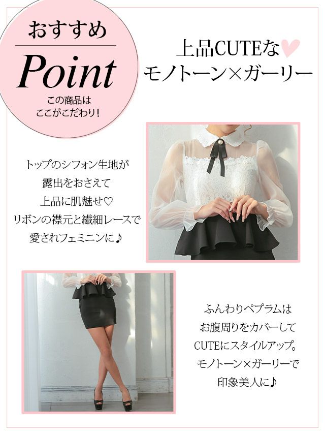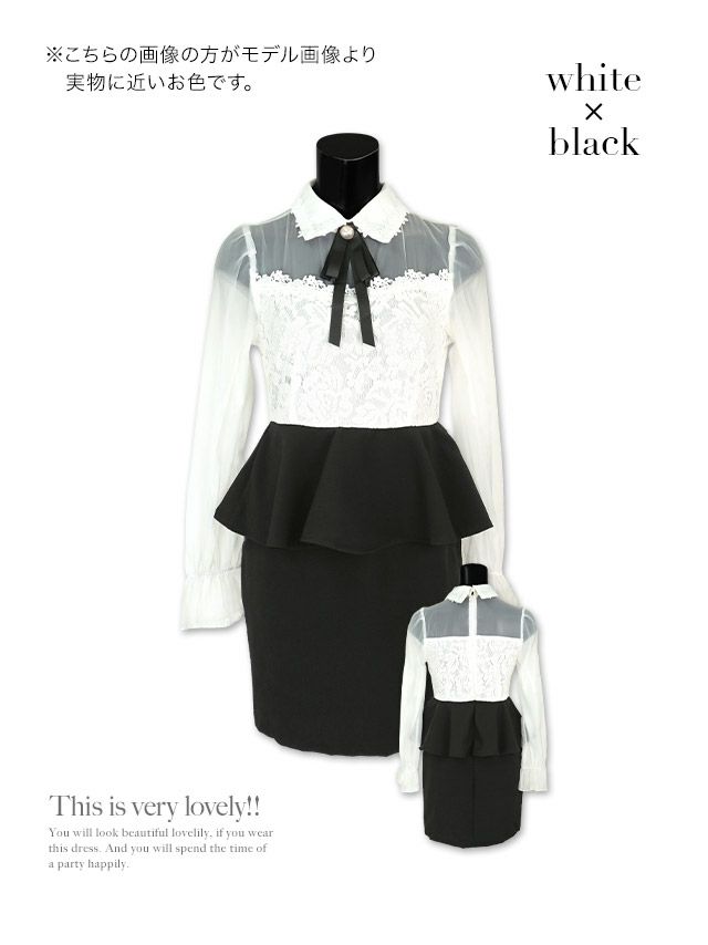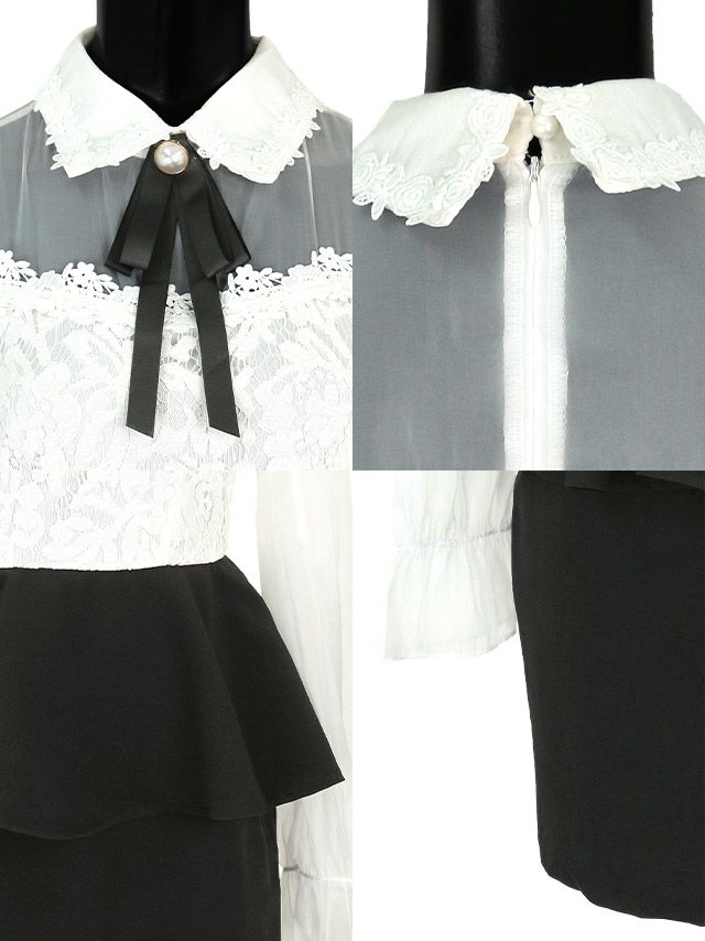 上品キュートなモノトーンドレス 襟付きリボンブローチ付 ウエストペプラム 長袖 袖あり パフスリーブ タイトミニドレス (Sサイズ~XXサイズ) (ハラちゃん/キャバドレス着用)