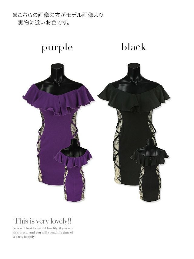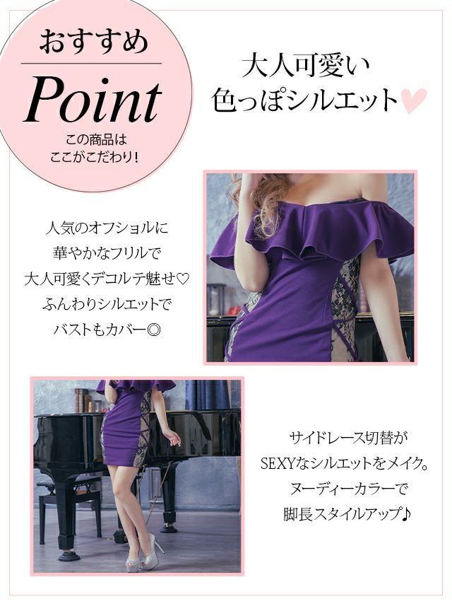 オフショルダー胸元フリルサイドチュールクロスデザイン切替タイトミニドレス (Sサイズ~XLサイズ) (聖菜/キャバドレス着用)