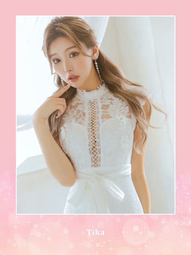5. フラワー総レースハイネックノースリーブウエストリボン裾フリルタイトミニドレス (Sサイズ~Lサイズ) (せいせい/キャバドレス着用)