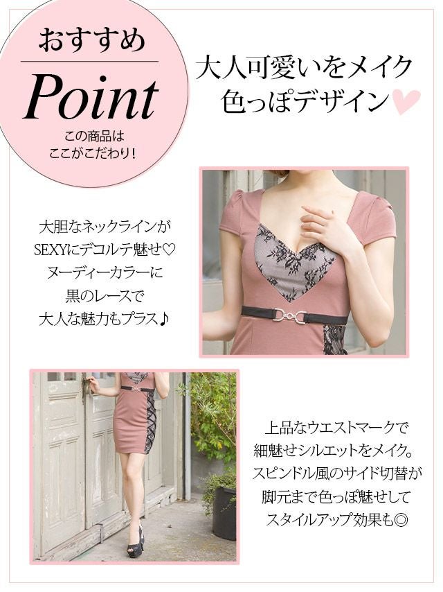 着るだけでフェロモン香る大人な1着♪ ハートカットヌーディーフラワーサイドクロス切替ベルト付き半袖タイトミニドレス (Sサイズ~XLサイズ) (ゆんころ/キャバドレス着用)