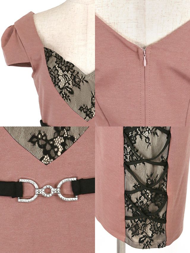 ハートカットヌーディーフラワーサイドクロス切替ベルト付き半袖タイトミニドレスの商品詳細1