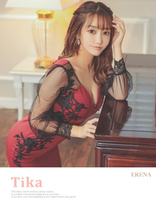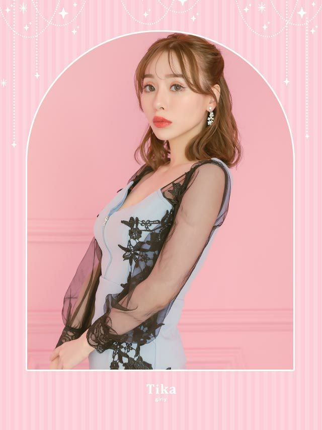 キャバドレス ミニ丈 袖あり 大きいサイズ キャバクラ Tika ティカ 長袖シアーパフスリーブ切替フロントジップフラワー刺繍タイトミニドレス