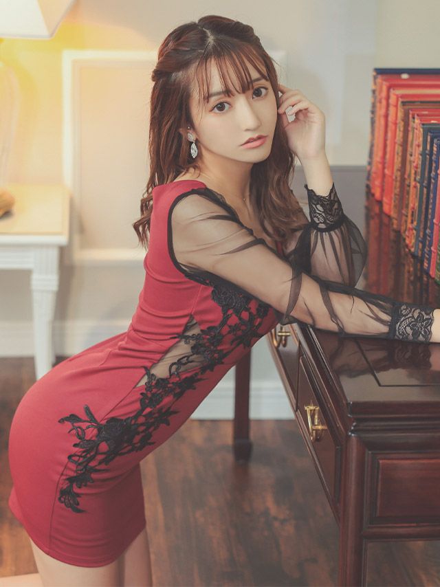4. 長袖 袖あり シアー パフスリーブ フロントジップ フラワー刺繍 くびれ タイトミニドレス (Sサイズ~XXLサイズ) (えれな/キャバドレス着用)