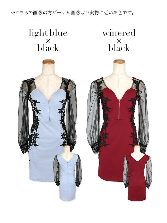 長袖シアーパフスリーブ切替フロントジップフラワー刺繍くびれタイトミニドレスのカラーバリエーション