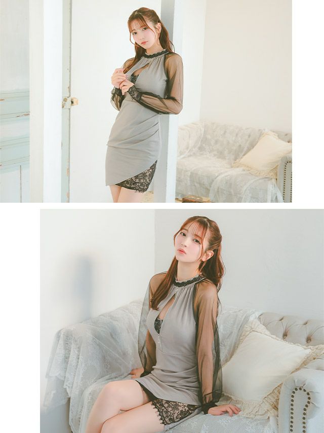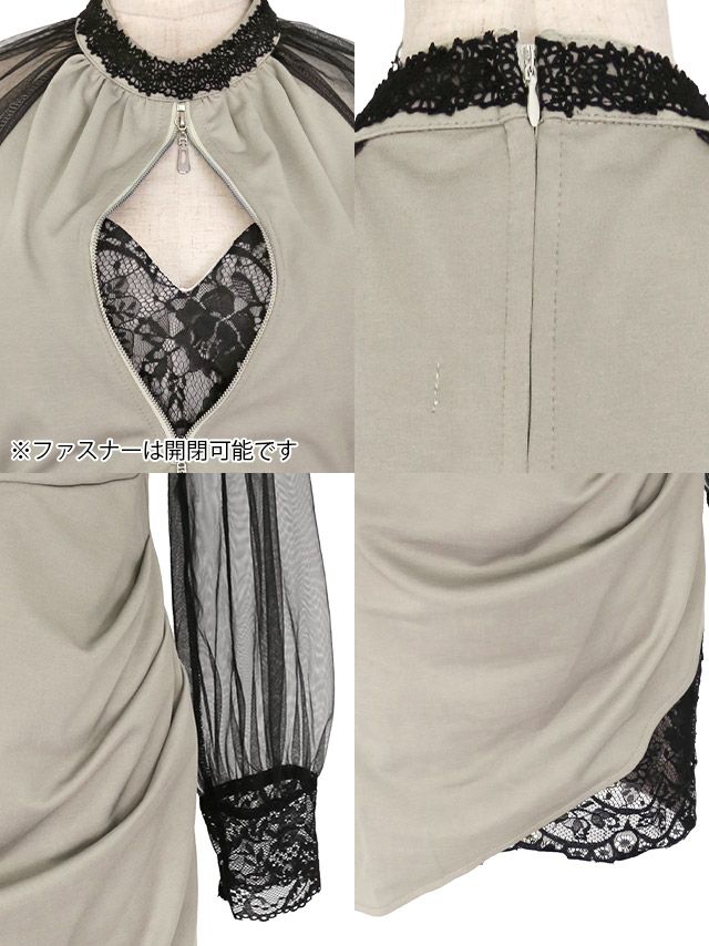 シアー長袖ハイネックフロントジップアシメレース切り替えタイトミニドレスのカラーバリエーション
