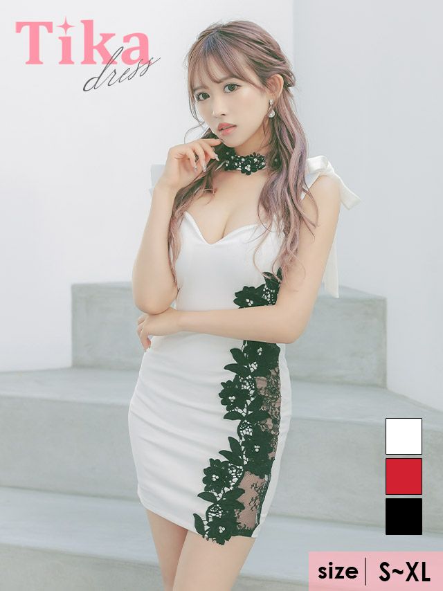 キャバドレス ミニ丈 セクシー 大きいサイズ キャバクラ Tika ティカ チョーカーネックアシメスリーブ立体フラワーレースビジュー切替タイトミニドレス