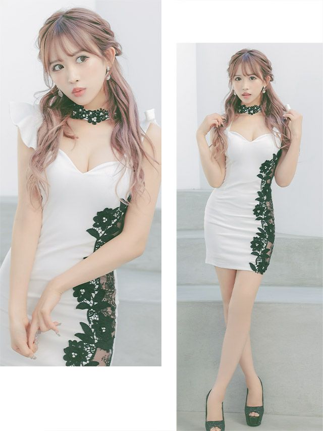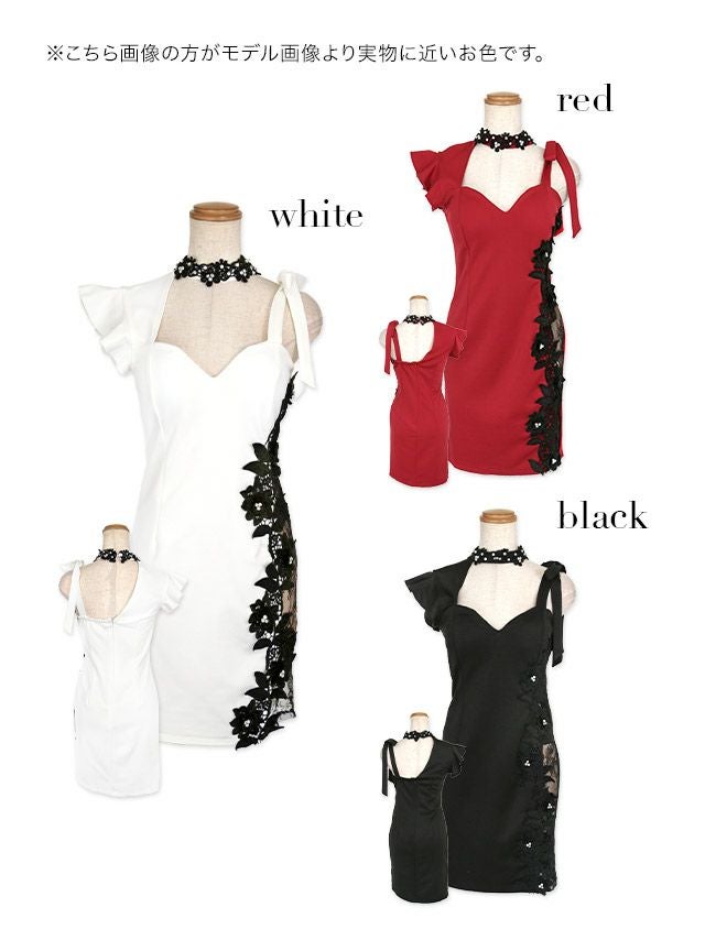 チョーカーネックアシメスリーブ立体フラワーレースビジュー切替タイトミニドレスのカラーバリエーション