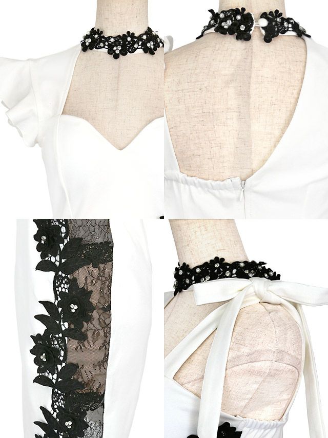 チョーカーネックアシメスリーブ立体フラワーレースビジュー切替タイトミニドレスの商品詳細1