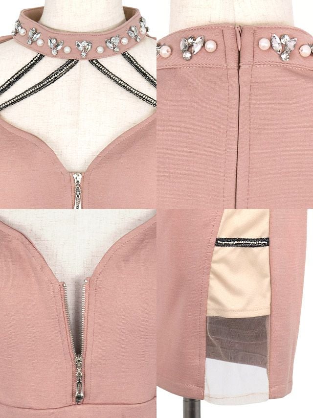 3. ビジューチョーカーネック バストフロントジップ サイドヌーディーカラー 長袖 袖あり タイトミニドレス (Sサイズ~XLサイズ) (橋本梨菜/キャバドレス着用)