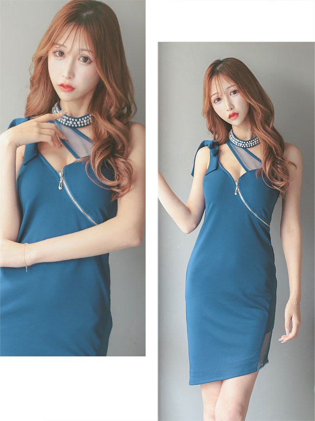 3. ネックビジュー付き ワンショルダー デコルテ シアーカットアウト バストジップ アシメタイトミニドレス (Sサイズ~Lサイズ) (浦西ひかる/キャバドレス着用)