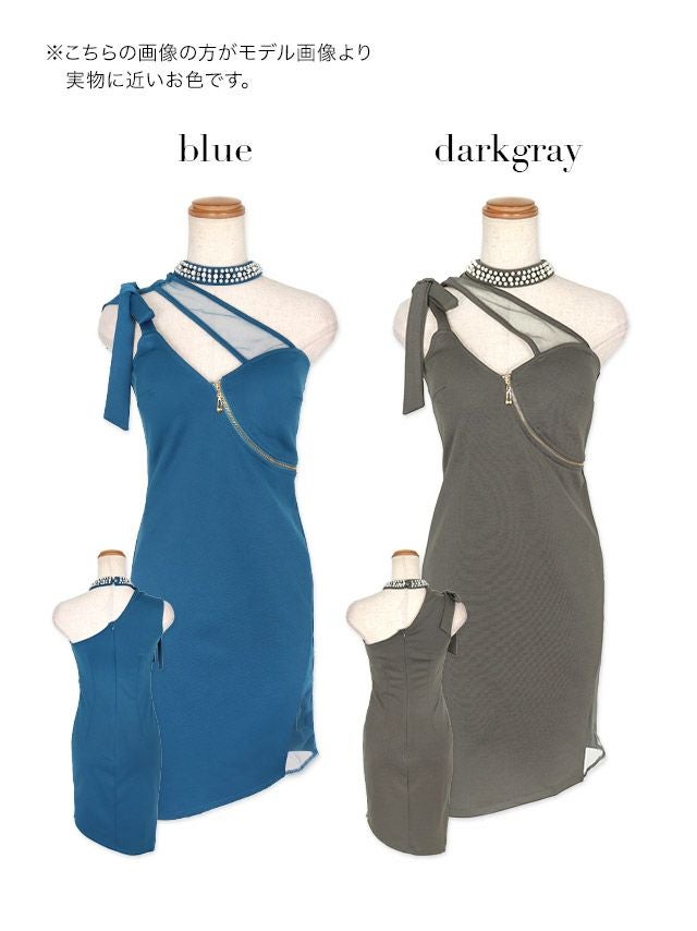 ネックビジュー付きワンショルダーデコルテシアーカットアウトバストジップアシメタイトミニドレスのカラーバリエーション