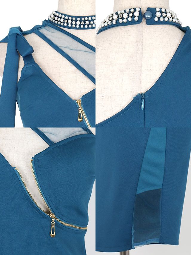 ネックビジュー付きワンショルダーデコルテシアーカットアウトバストジップアシメタイトミニドレスの商品詳細画像2