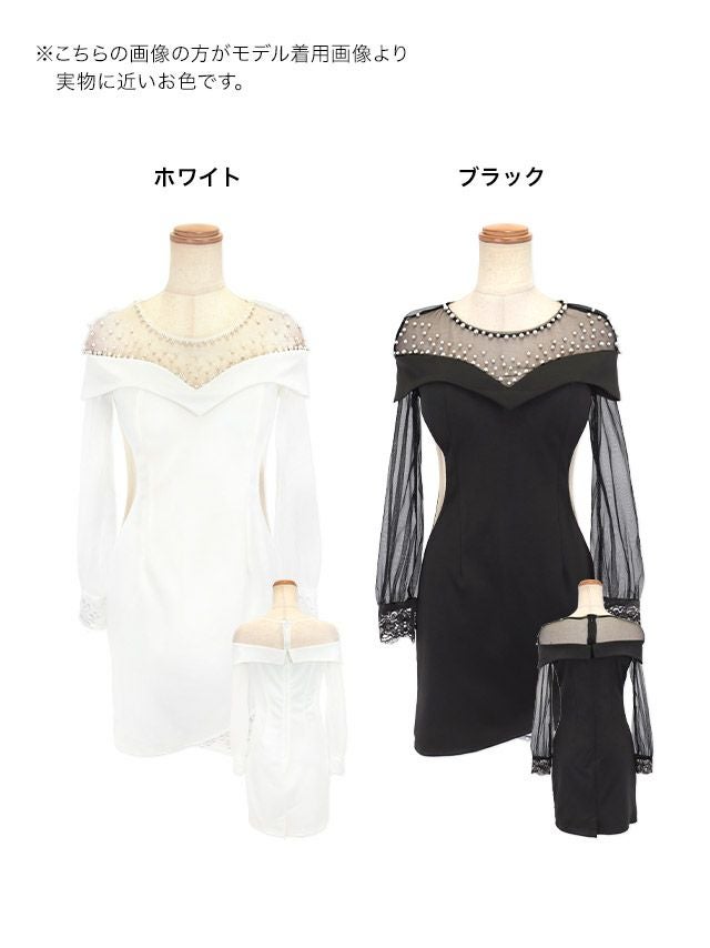 ドレッシーな雰囲気漂う♪ シアーチュール長袖 袖ありゴージャスパール切り替えくびれワンカラーストレッチタイトミニドレス (Sサイズ~Lサイズ) (せいせい/キャバドレス着用)