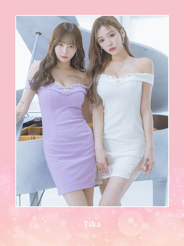 オフショルダーキラキラフラワーパールビジューサイドチュール切替タイトミニドレスのカラーバリエーション