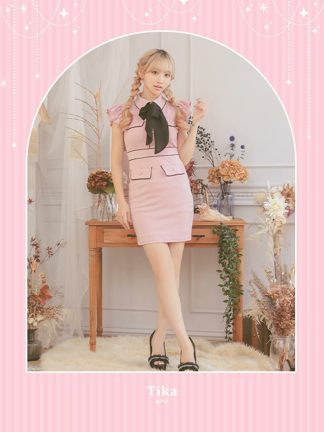 3. 襟付き ノースリーブ フリル袖 ネックリボン パイピング タイトミニドレス (Sサイズ~Lサイズ) (重川茉弥/キャバドレス着用)