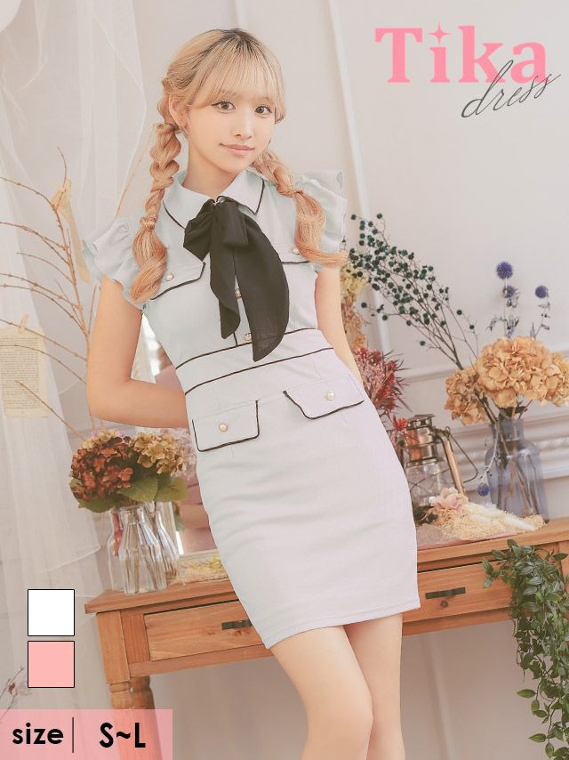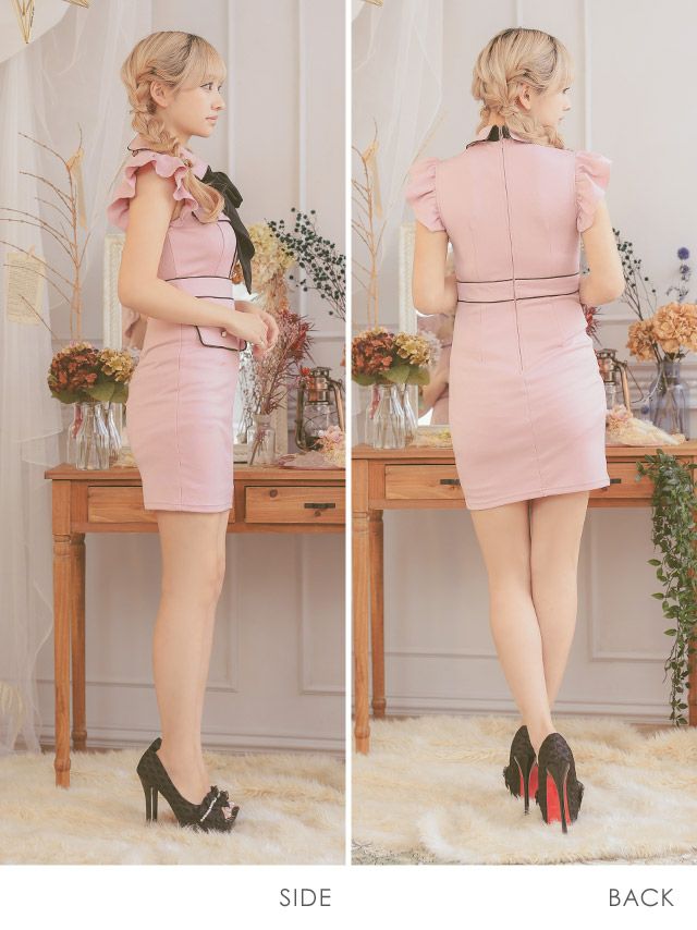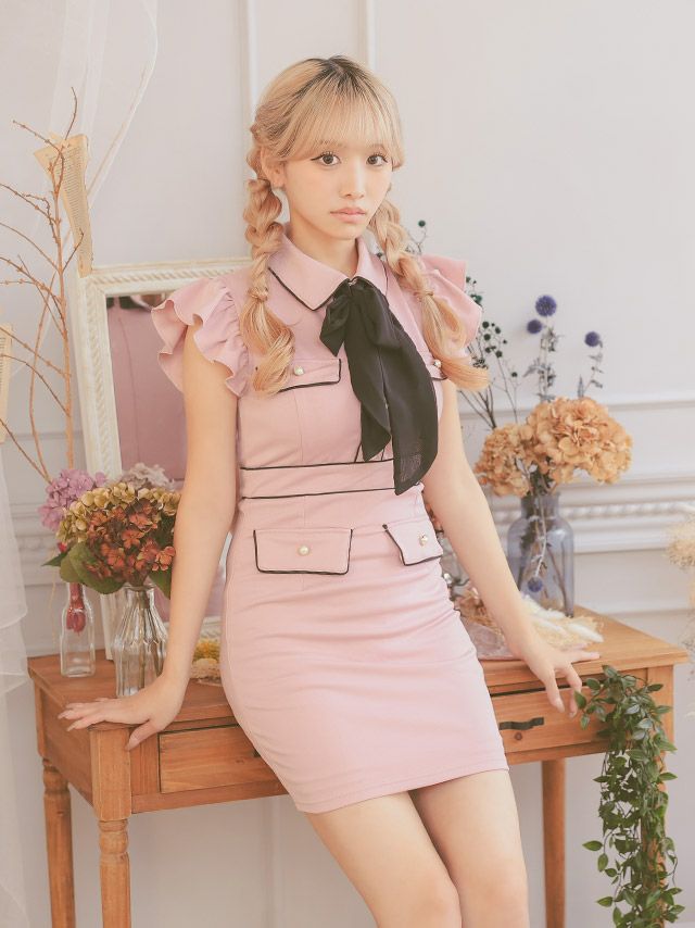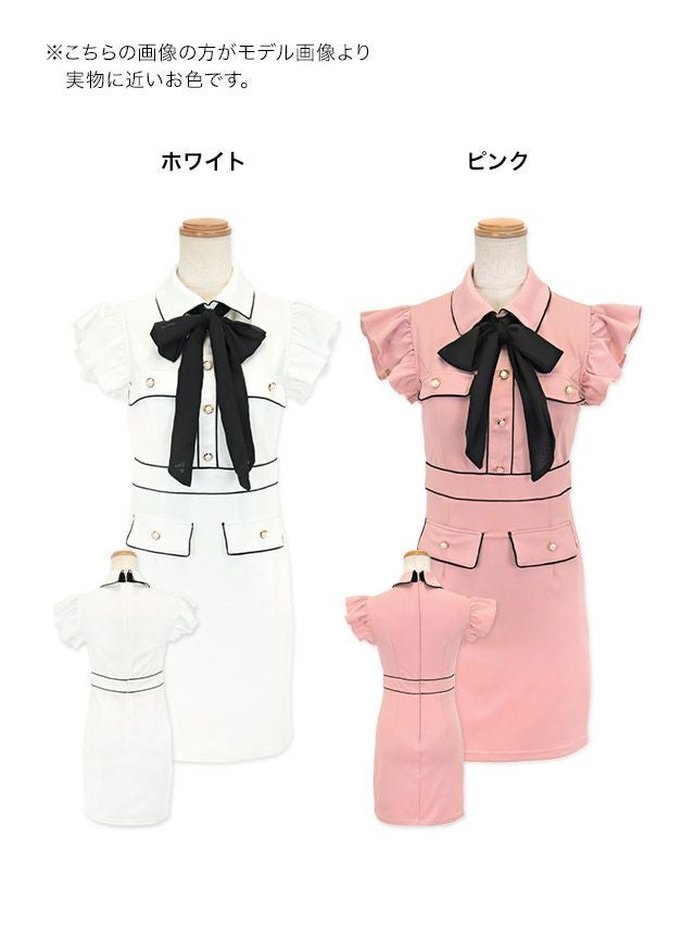 4. 襟付き ノースリーブ フリル袖 ネックリボン パイピング タイトミニドレス (Sサイズ~Lサイズ) (重川茉弥/キャバドレス着用)
