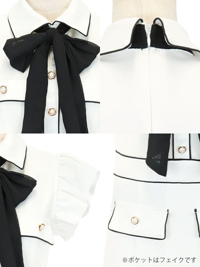 襟付きネックリボンノースリーブフリル袖パイピングタイトミニドレスの商品詳細1