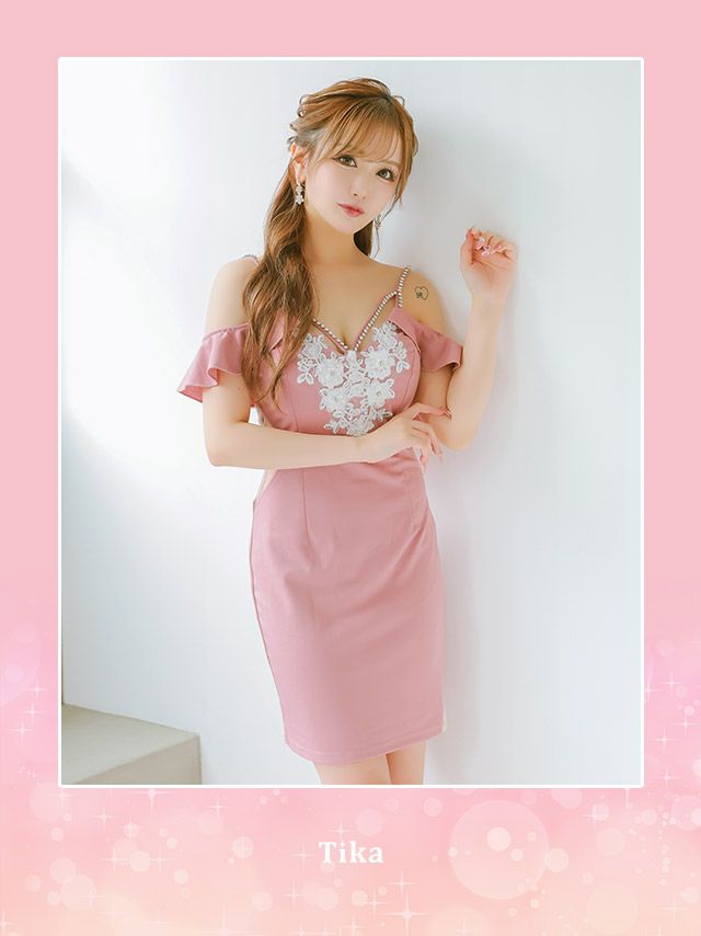 4. ビジュー付き 肩出し 二の腕カバー フリルショルダー フラワー刺繍 シアーくびれ バストコード 谷間魅せ タイトミニドレス (Sサイズ~XLサイズ) (りせり/キャバドレス着用)