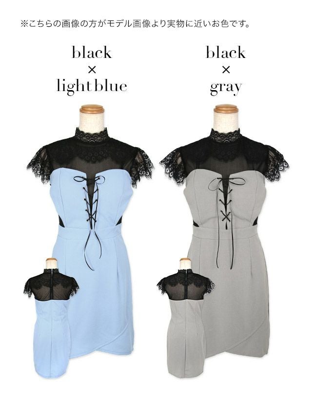 ハイネック半袖レースシアーくびれ切り替え編み上げラップタイトミニドレスのカラーバリエーション