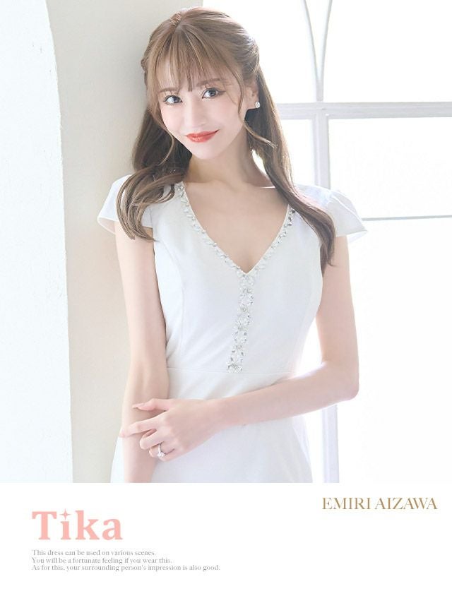 キャバドレス ミニ丈 袖あり 大きいサイズ キャバクラ クラブ Tika ティカ ワンカラー半袖Vネックビジュー付きサイドシアークロス切替タイトミニドレス