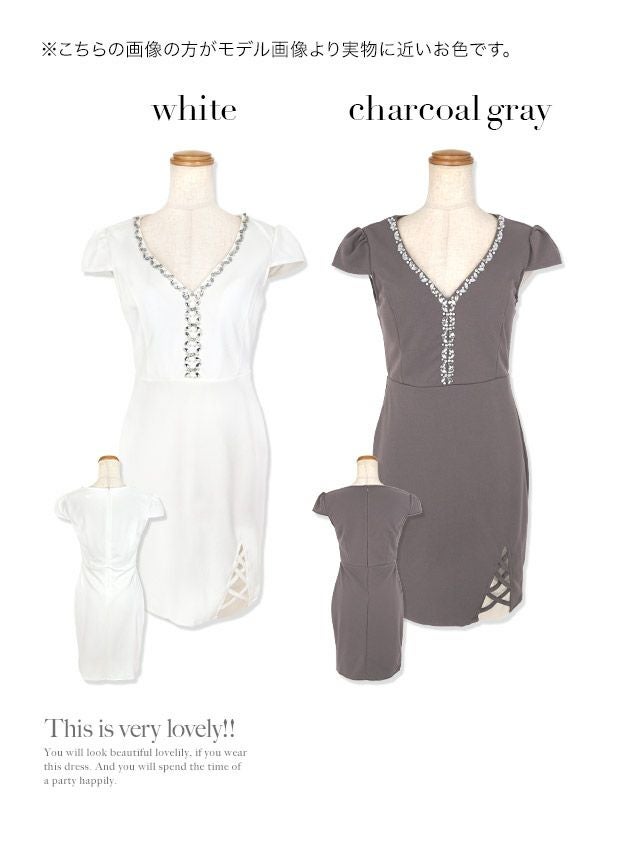 ワンカラー半袖Vネックビジュー付きサイドシアークロス切替タイトミニドレスのカラーバリエーション