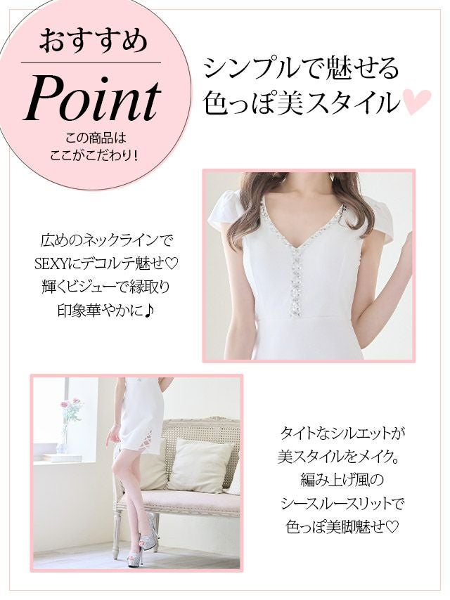 ワンカラー半袖Vネックビジュー付きサイドシアークロス切替タイトミニドレスの商品特徴