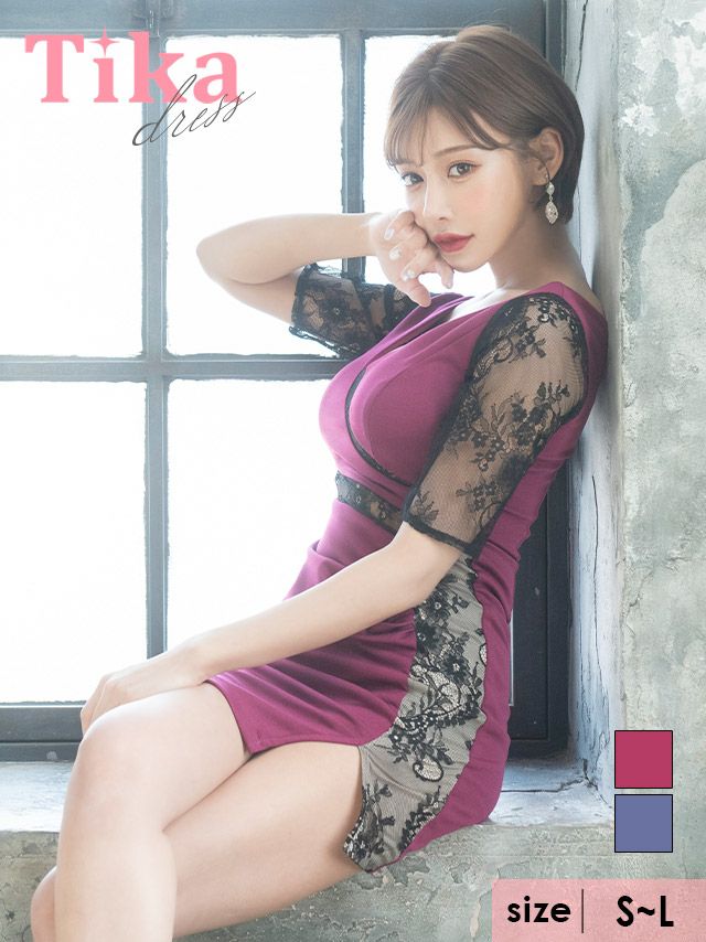 4. フラワーレースサイドヌーディー切替袖ありタイトミニドレス (Sサイズ~Lサイズ) (明日花キララ/キャバドレス着用)