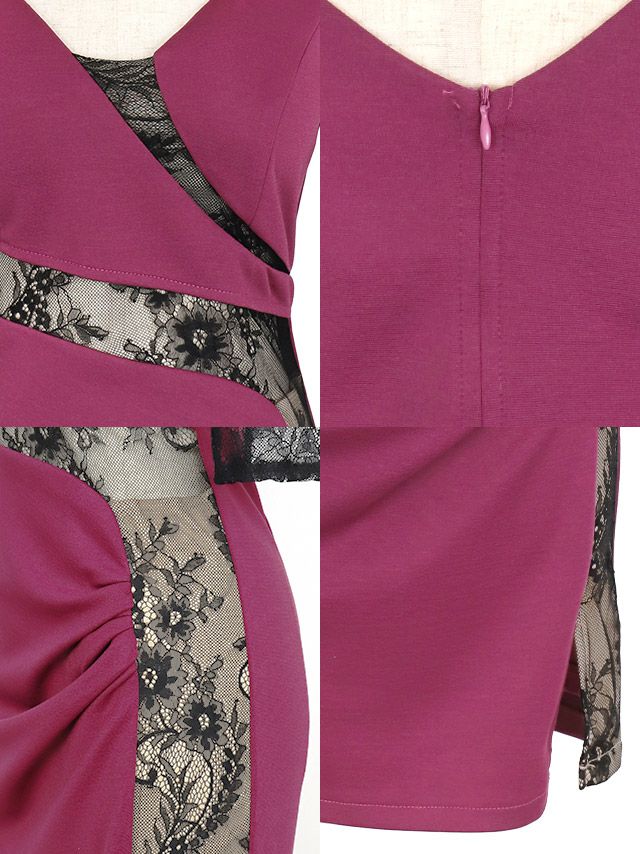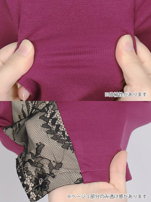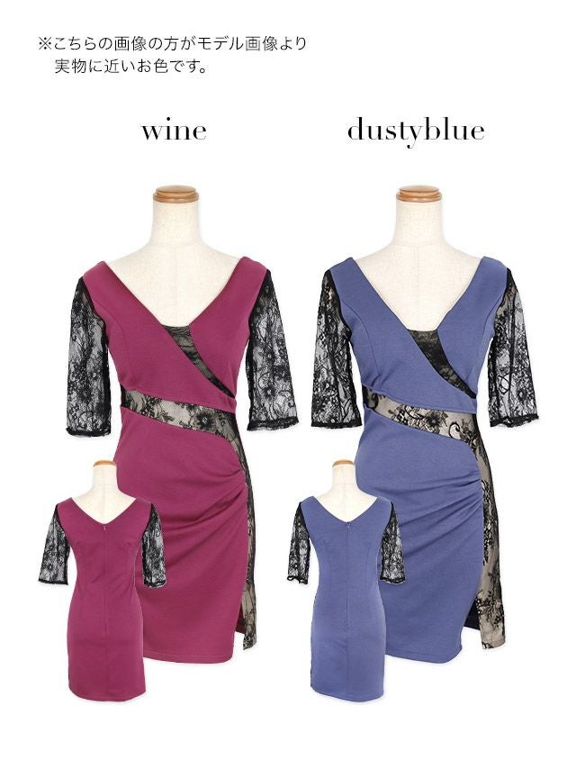 フラワーレースサイドスリットヌーディー切替袖ありタイトミニドレスのカラーバリエーション