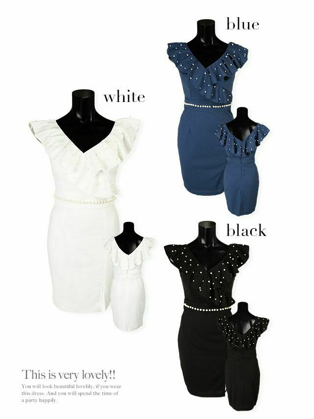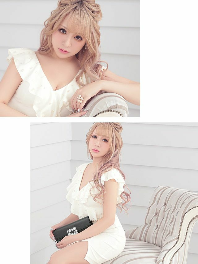 3. 胸元フリル袖ウエストパール付Vネックコクーンミニドレス (Sサイズ~Lサイズ) (さくりな/キャバドレス着用)