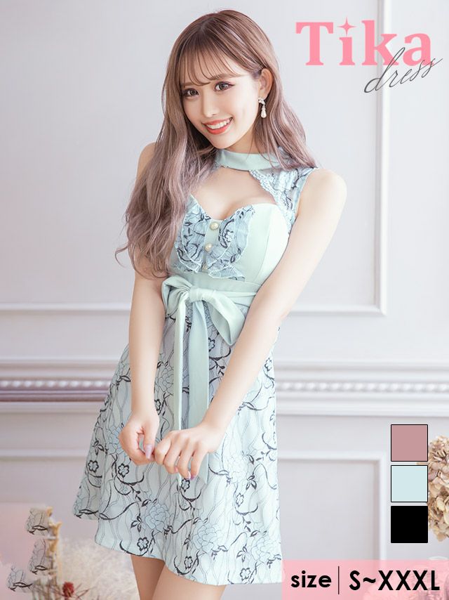 3. チョーカーネック風刺繍レース胸元カットリボンノースリーブハイウエスト切替フレアミニドレス (Sサイズ~XXXLサイズ) (聖菜/キャバドレス着用)