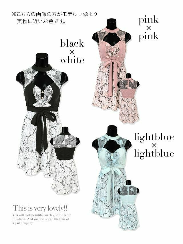 チョーカーネック風刺繍レース胸元カットリボンノースリーブハイウエスト切替フレアミニドレスのカラーバリエーション