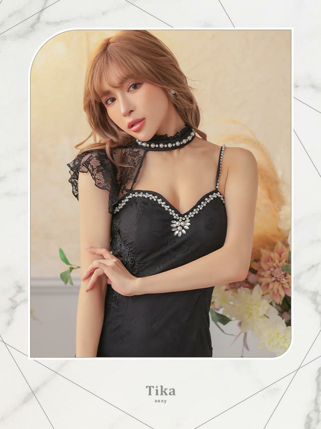 キャバドレス ミニ丈 大きいサイズ 黒 白 Tika ティカ チョーカーネックワンショルダーハートカットアウトビジュー総レースタイトミニドレス