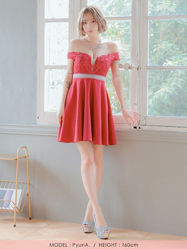 5. バストシースルー フラワー刺繍 ウエストビジュー オフショルダー 谷間魅せ フレアミニドレス (Sサイズ~XXXXLサイズ) (りせり/キャバドレス着用)