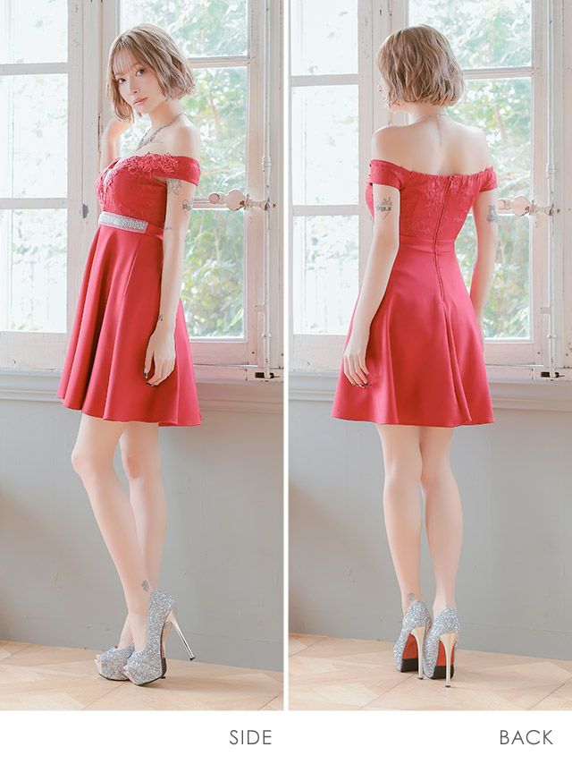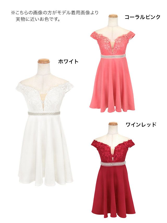 フラワー刺繍ウエストビジューオフショルダーフレアミニドレスのカラーバリエーション