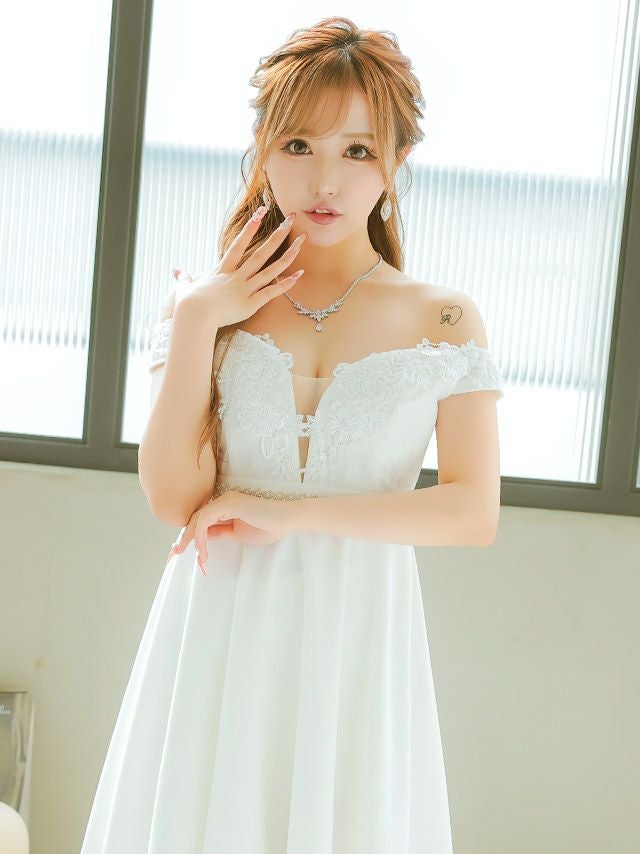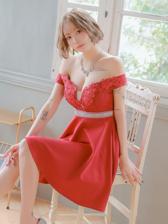 5. フラワー刺繍 バストシースルー オフショルダー ウエストビジュー 谷間魅せ フレアミニドレス (Sサイズ~XXXXLサイズ) (PyunA./キャバドレス着用)