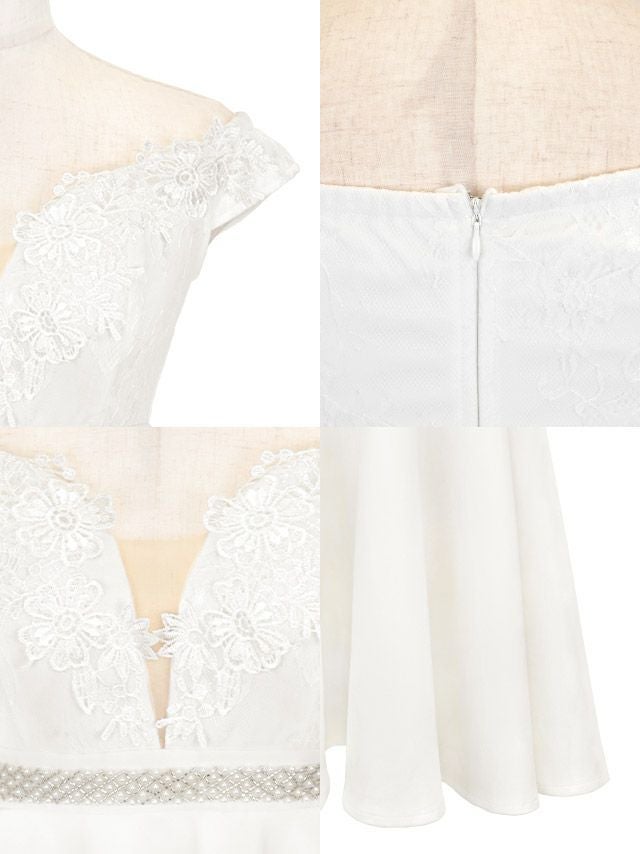 フラワー刺繍 バストシアー オフショルダー ウエストビジュー フレア ミニ ドレス