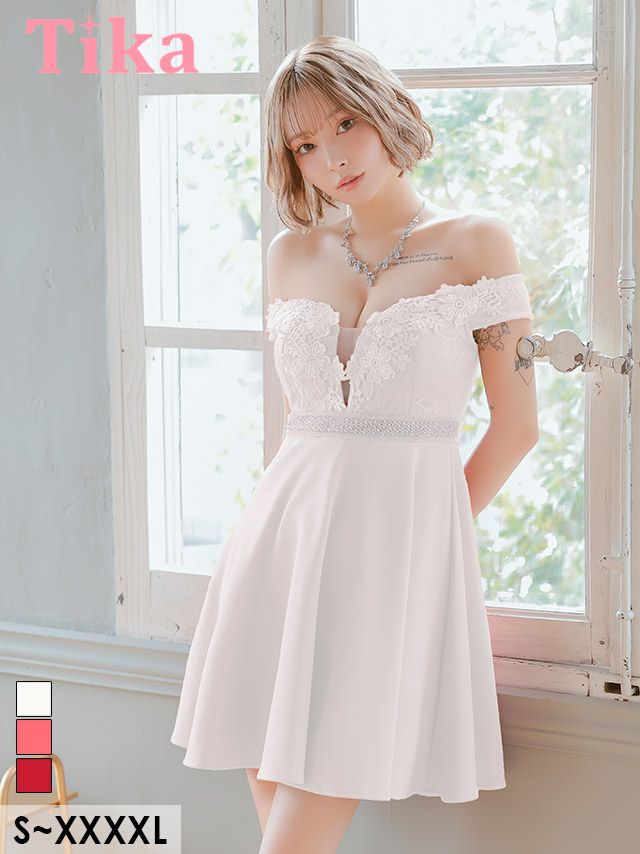 可愛くスタイルアップを叶える♪ フラワー刺繍 バストシースルー オフショルダー ウエストビジュー 谷間魅せ フレアミニドレス (Sサイズ~XXXXLサイズ) (PyunA./キャバドレス着用)