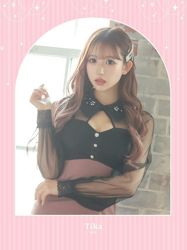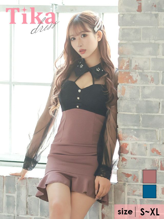 女性らしさを高める♪ シアースリーブ ビジュー襟付き レース切替 長袖 袖あり タイトミニドレス (Sサイズ~XLサイズ) (明日花キララ/キャバドレス着用)