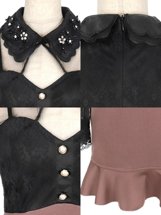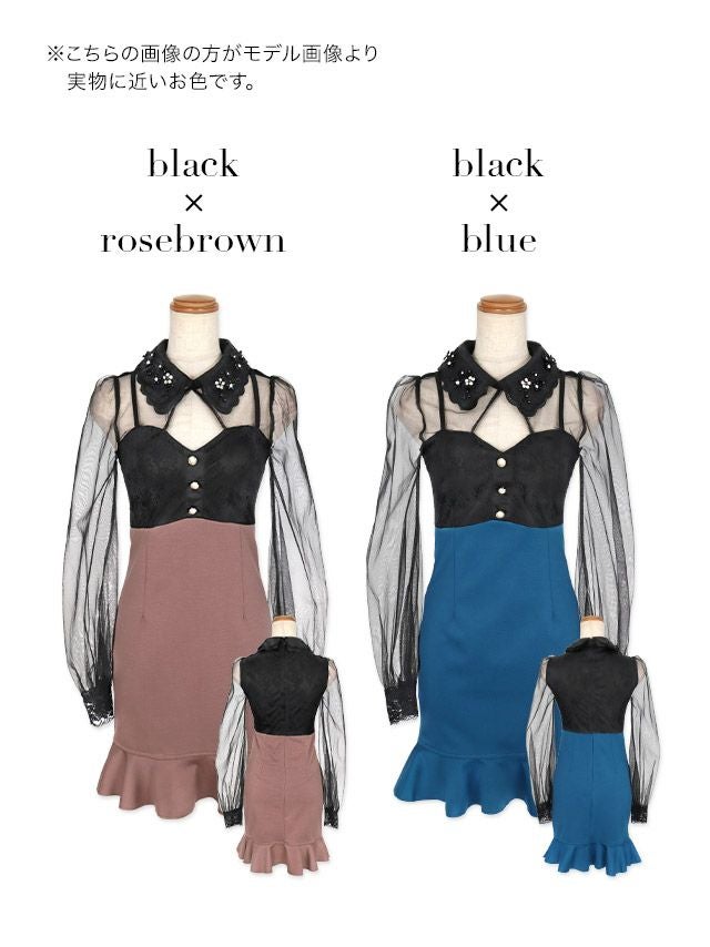 シアースリーブビジュー襟付きレース切替長袖タイトミニドレスのカラーバリエーション