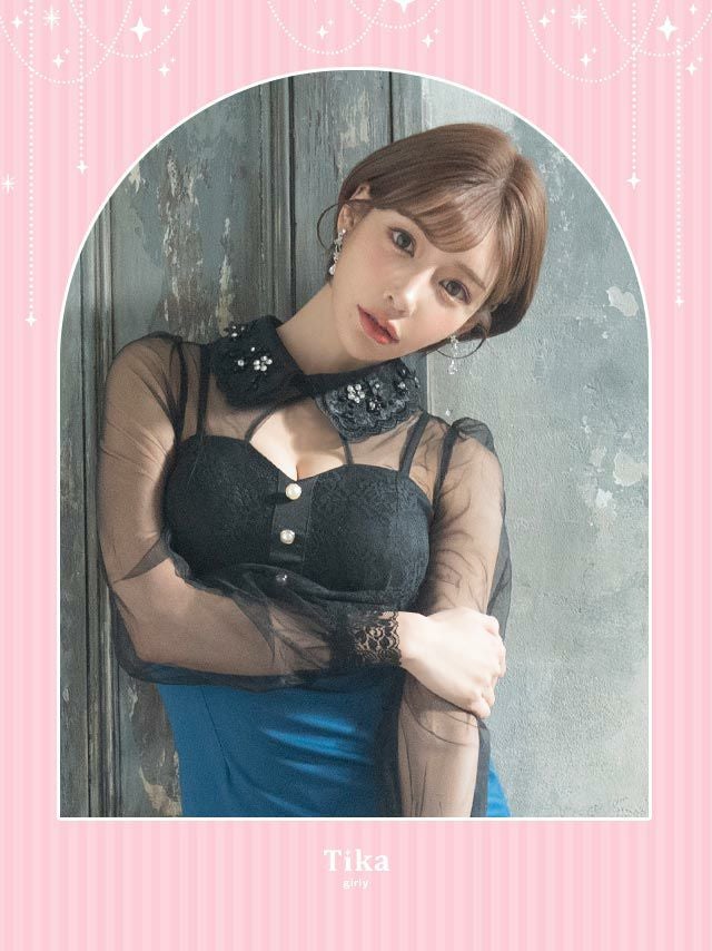 4. シアースリーブ ビジュー襟付き レース切替 長袖 袖あり タイトミニドレス (Sサイズ~XLサイズ) (明日花キララ/キャバドレス着用)