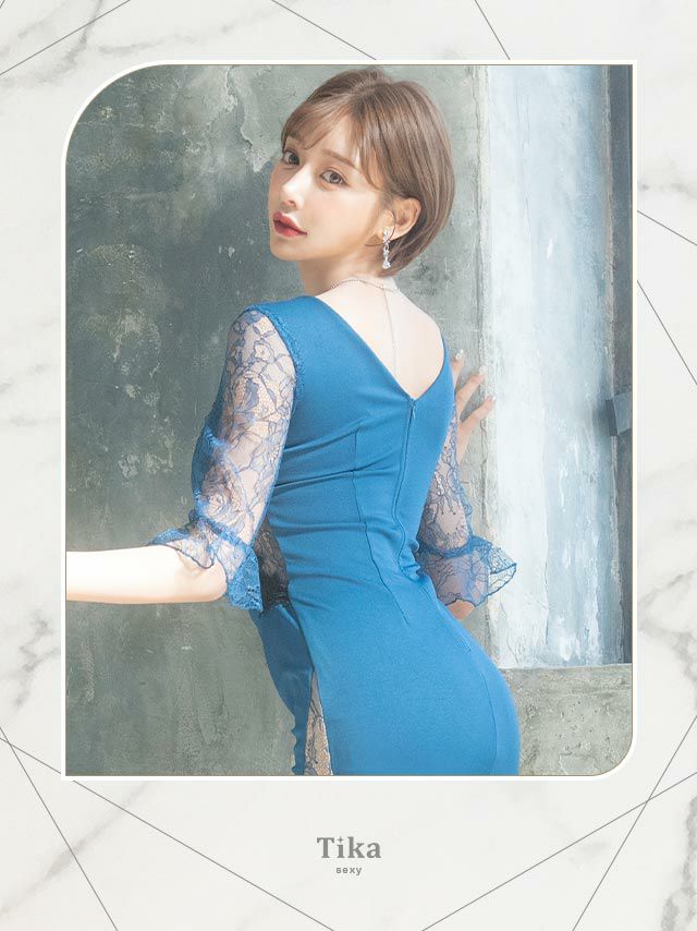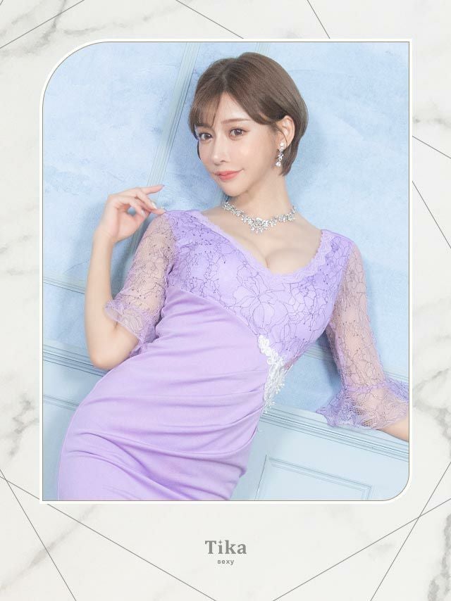 キャバドレス ミニ丈 大きいサイズ キャバクラ クラブ Tika ティカ フラワー刺繍レース切替サイドシアー袖ありタイトミニドレス