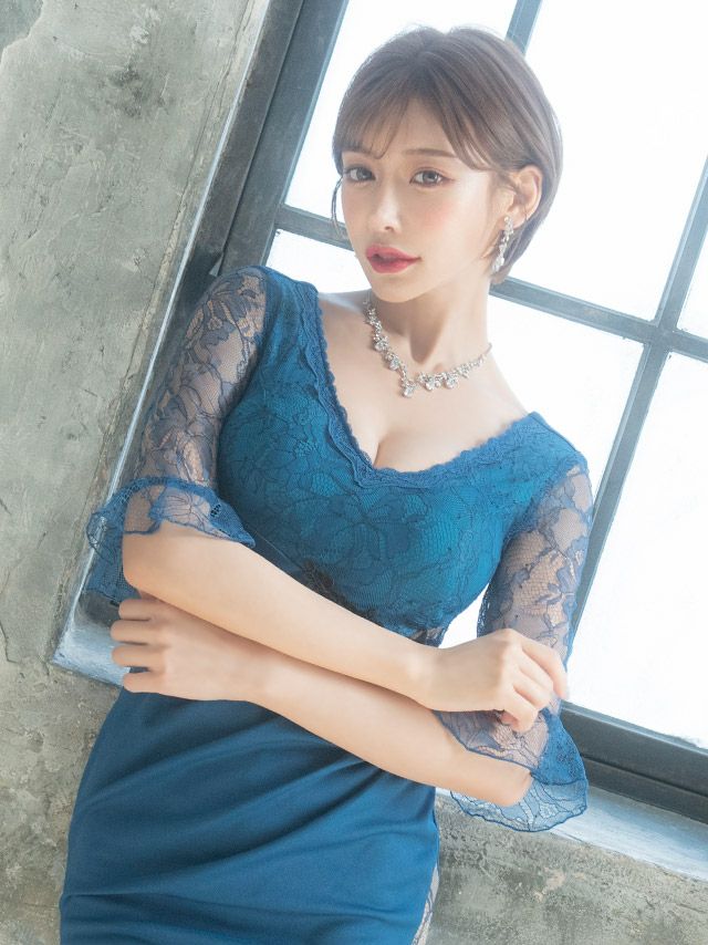 5. フラワー刺繍レース切替サイドシアー袖ありタイトミニドレス (Sサイズ~XXLサイズ) (明日花キララ/キャバドレス着用)
