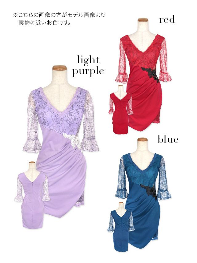 フラワー刺繍レース切替サイドシアー袖ありタイトミニドレスのカラーバリエーション
