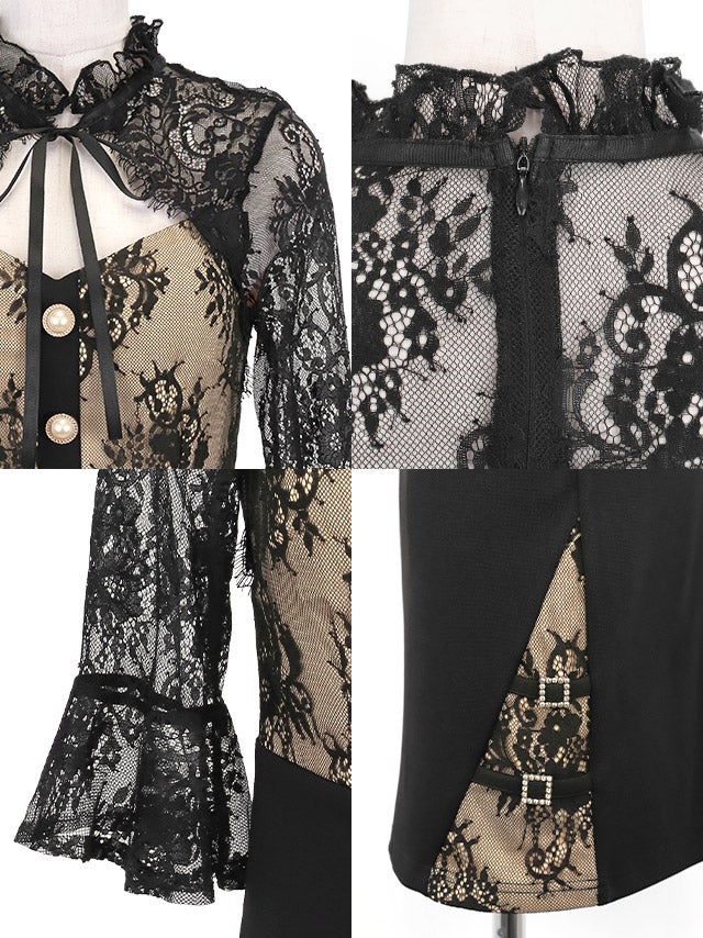 ミニドレス タイト バストカット ネックリボン フラワーレース 袖あり 二の腕カバー 黒 XL XXL キャバドレスの商品特徴