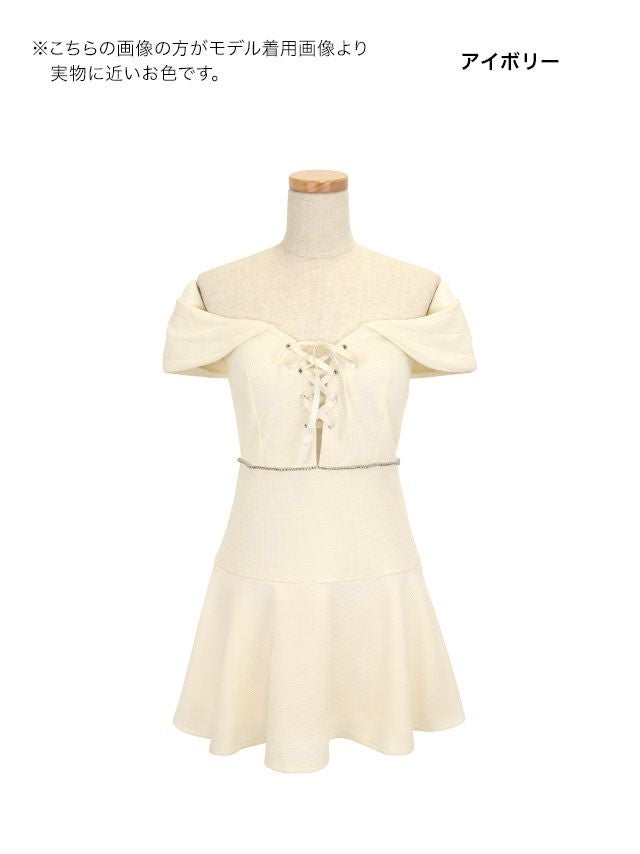 オフショルダー クロスデザイン 谷間見せ バストシースルー フレアミニドレスのメイン画像
