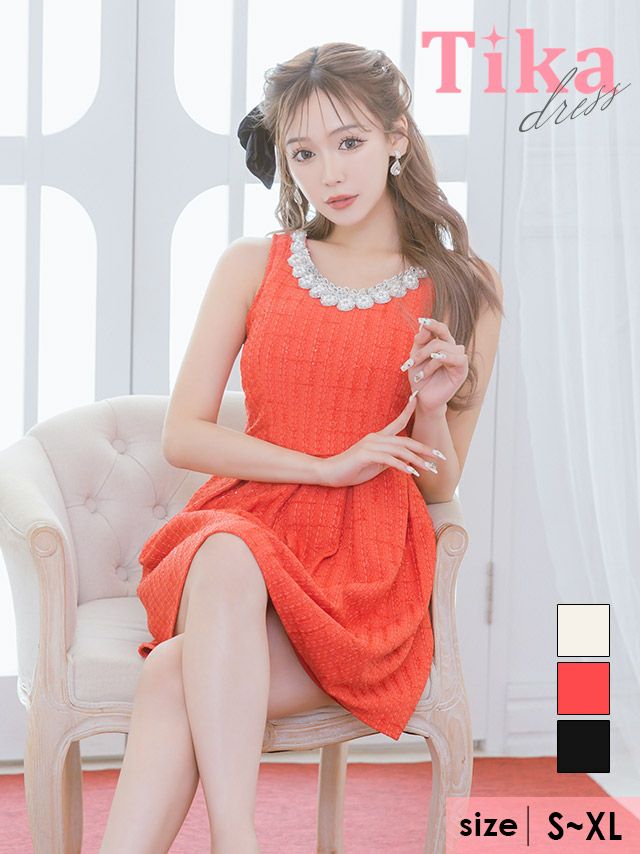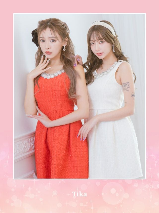 3. ノースリーブフラワーモチーフビジューツイード調ラメ入りタックフレアミニドレス (Sサイズ~XLサイズ) (PyunA./キャバドレス着用)