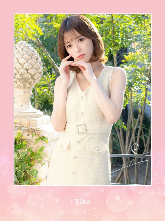 4. [SALE] ノースリーブフロントビジューボタンウエストベルト付き裾フリルツイードタイトミニドレス (Sサイズ~XLサイズ) (若林萌々/キャバドレス着用)