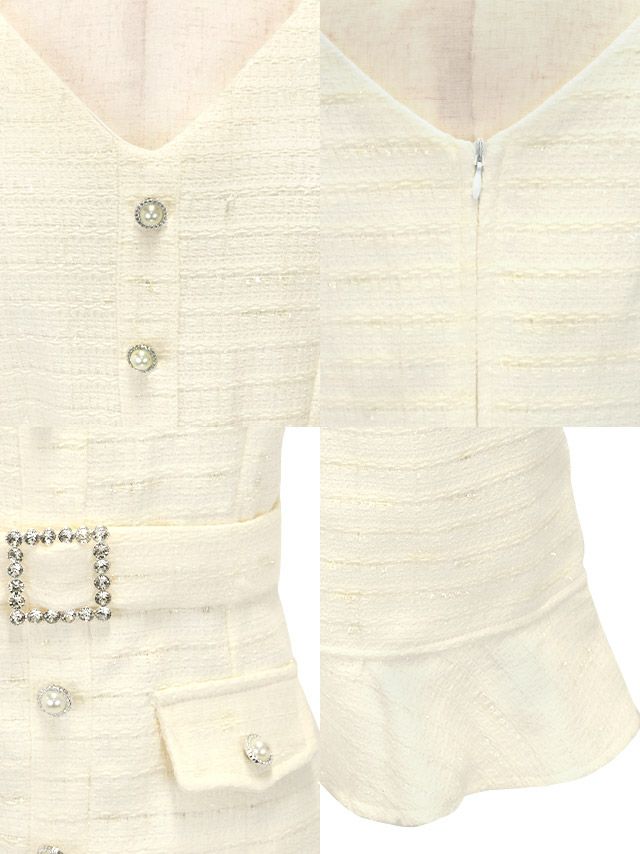 ノースリーブフロントビジューボタンウエストベルト付き裾フリルツイードタイトミニドレスの商品詳細1