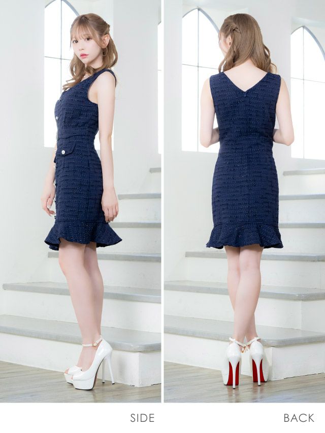 5. [SALE] ノースリーブフロントビジューボタンウエストベルト付き裾フリルツイードタイトミニドレス (Sサイズ~XLサイズ) (若林萌々/キャバドレス着用)